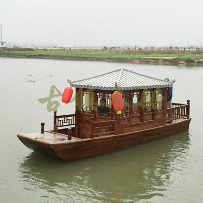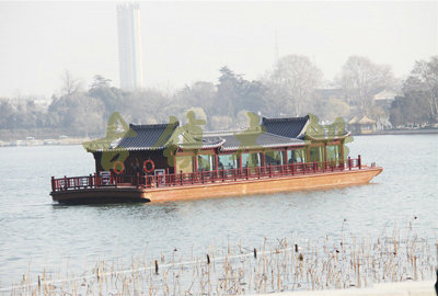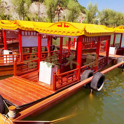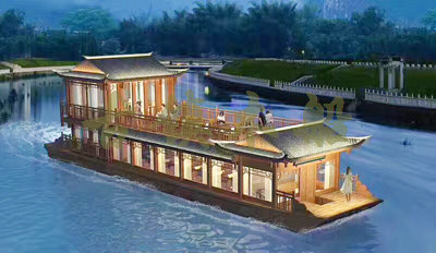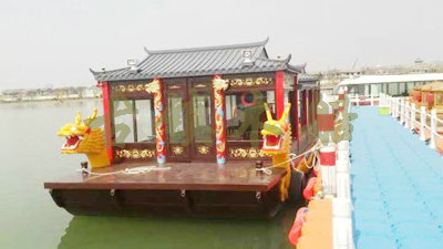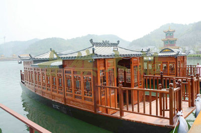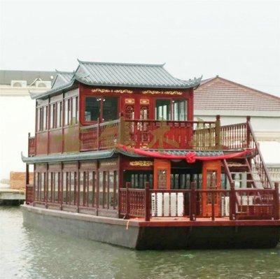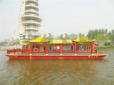 畫舫船就是裝飾古典華麗的游船,是"中國風(fēng)"的仿古游船,結(jié)合古典園林建筑,體現(xiàn)了中華文明的古典藝術(shù).畫舫船豪華而又古典,船上的建筑按照中國古代建筑里的亭臺樓閣,建筑工藝之復(fù)雜,要求之嚴(yán)格,仿古畫舫游船的特點飛檐翹角、玲瓏精致的四角亭子逐漸成形,赫然立于船頭,美人靠、盤龍柱子、彩畫……龍柱上的浮雕盤龍和祥云一層扣著一層,層層錯落有致,雕刻精細(xì)到盤龍身上的每一個鱗片都細(xì)細(xì)可數(shù),古代皇家標(biāo)志性元素,在畫舫船上體現(xiàn)的淋漓盡致。除了雕刻、花窗,整條船還有一個看點,那就是弧線優(yōu)美、高高翹起的船尾。游船并不大,長約10米、寬3米,但是整體看起來堪稱一件藝術(shù)品。船尾的雕花欄桿與船艙、船頭的雕刻遙相呼應(yīng),船身四周貼著浮雕祥云,給整條船增添了富貴、華麗的氣質(zhì)。